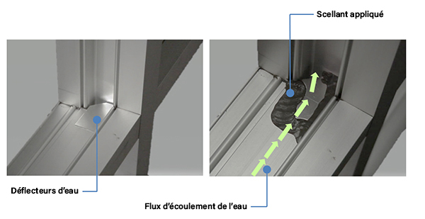 Des déflecteurs d’eau doivent être installés à l’emplacement de chaque meneau horizontal dans une façade de magasin. Ils servent à rediriger l’eau qui atteint le meneau horizontal au-dessus du meneau vertical pour qu’elle s’écoule le long du solin de seuil. Les déflecteurs sont nécessaires pour empêcher l’eau de couler sur la vitre sous le meneau horizontal. Sans eux, l’humidité s’installerait sur le verre, permettant ainsi à l’eau de s’infiltrer à l’intérieur et, possiblement, de compromettre l’étanchéité de l’unité de vitrage.